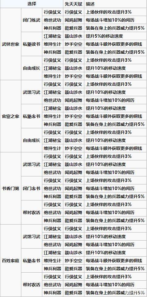 烟雨江湖新手开局有4大出生共36种天赋可以选择,那么烟雨江湖新手开局出生先天天赋选什么好?还不知道的小伙伴就来看看今天小编整理带来的解答吧: