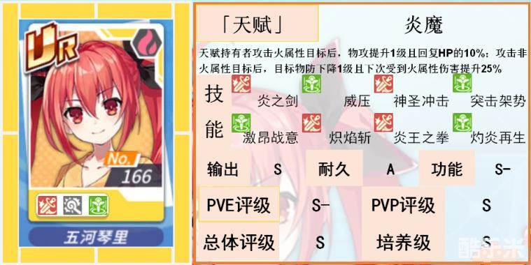 技能组相当优秀,基本没有废物技能。唯独一手威压有些屈才,并且天赋已经完全覆盖了威压减防的效果。输出技能方面,炎王之拳的威力尚可,但是因为低速的关系想要畏惧敌方可能性不大。专属技能炽焰斩,算是目前最强的横排技能之一。