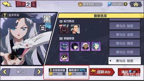 在选择好挑战层数,准备挑战前,可以考虑选择“2倍基础奖励”来获取更丰厚的奖励,选择“属性提升10%”来提高角色战力。