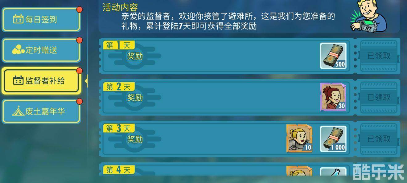 监督者补给的活动是常见的七日登录活动,避难所OL的七日登录活动可谓是非常的良心了!