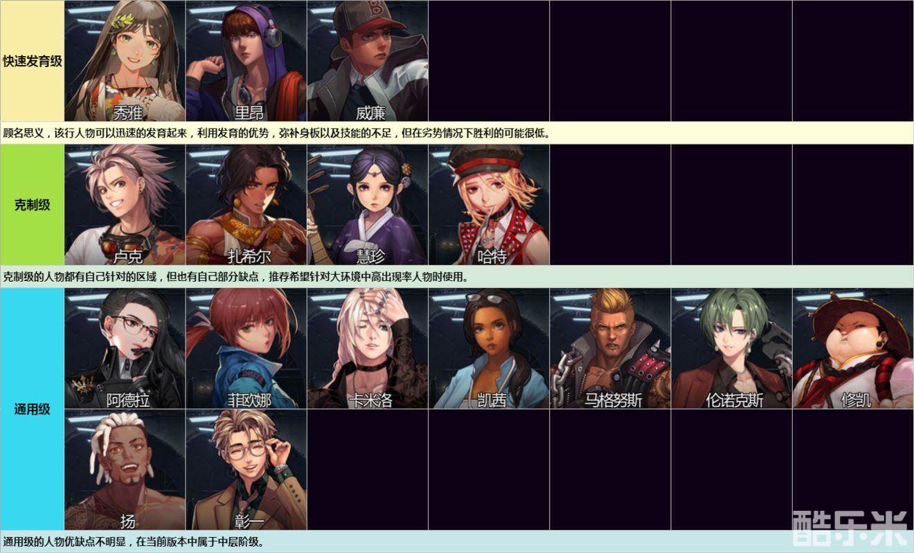 卡米洛:俗称基佬,脱衣又偷心,属性拉开一大截,玩转属性的男人。脱衣偷心同样也是对拼王者技能,但由于属性的机制,在前期抢点时用处较小,且穿刺这版本普遍较弱,因此到了通用级,但本身由于穿刺熟练度到D的加强,等待着一个契机飞升。