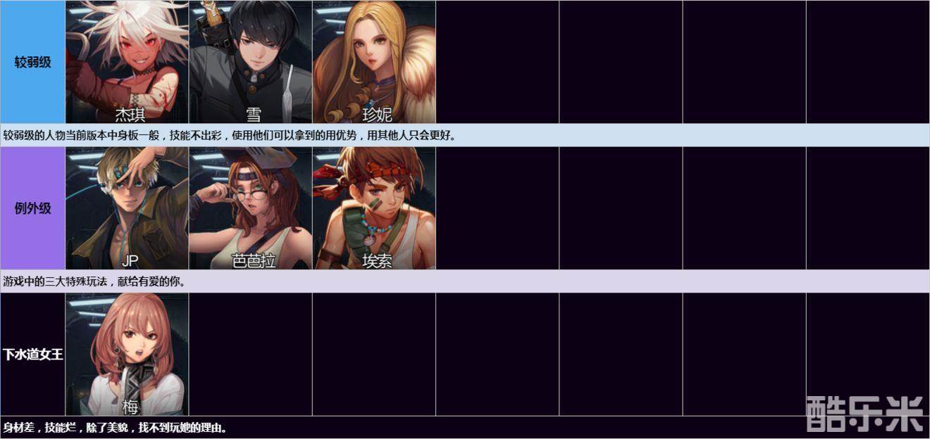 凯茜:All random人物,起手随机一系D,其他全F。非常考验玩家实力,但在弓箭枪械有弹药补给的现下,随到这两系会很亏节奏,不强,但能用,可又不推荐新手用。