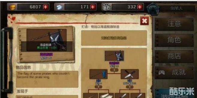 海盗旗,暴击流人物很好的选择,特性是暴击伤害+10%,制作还挺麻烦的,可以先做一个蓝色品质的旗帜(暴击伤害+5%),再顺手做一个双刀合成海盗旗。