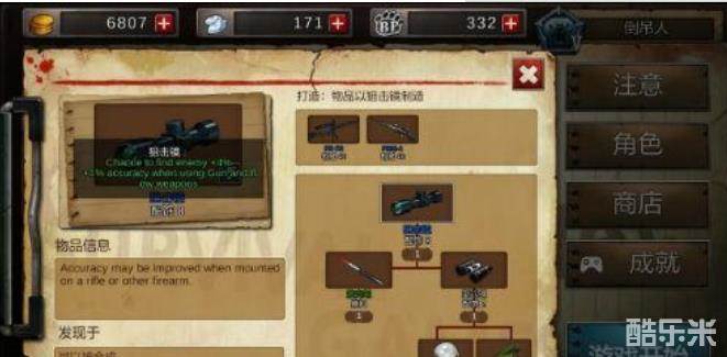 狙击镜,特性是发现敌人的几率+4%,枪和弓的精确度+1%,还不错的饰品,制作简单,可以用来中转做紫色品质枪械,枪械很适合的饰品或者说武器材料。