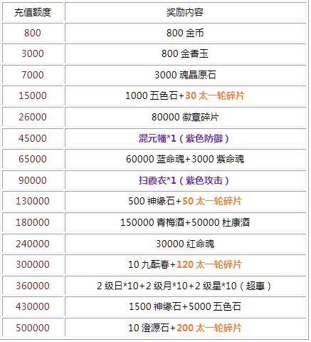 【活动内容】活动期间,游戏内累计充值达到对应金币,即可获得对应奖励;所有商品绝对超值,不信你自己看。相中哪个千万别手软!因为一犹豫也许就不知道何时能再见了。