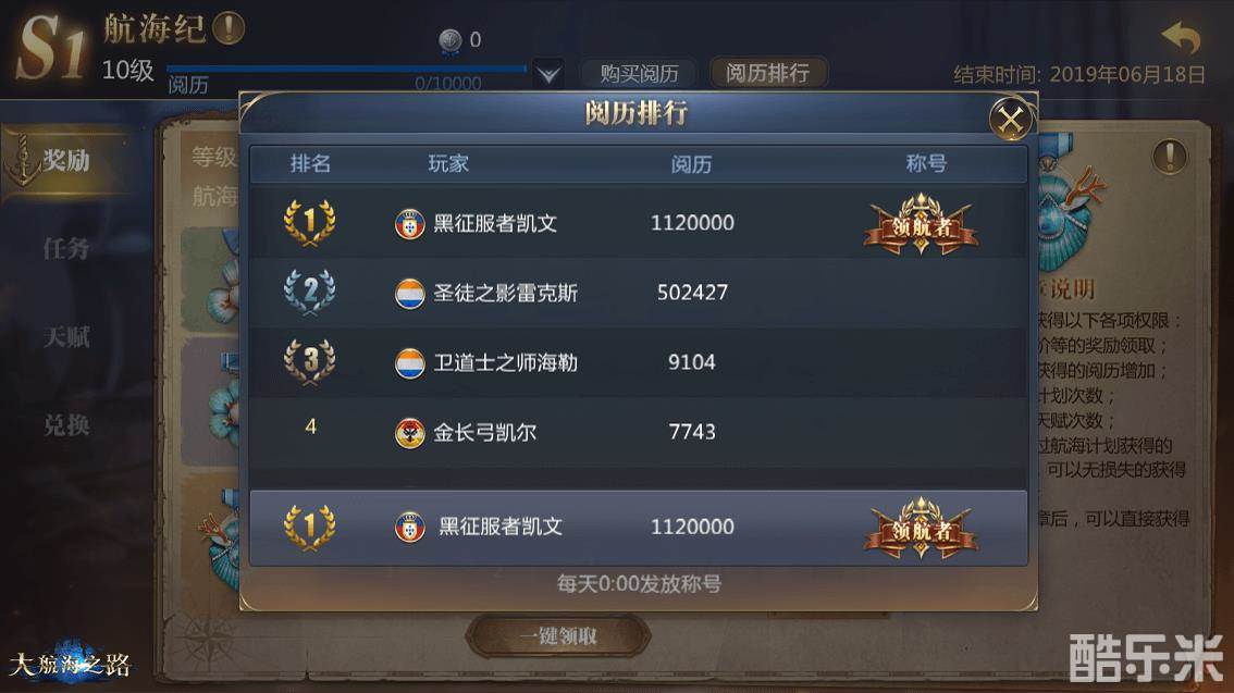 作为献给海上冒险家的终极奖励,每赛季,每个服务器内阅历获得排名第一的玩家(满级后获得的额外转换为积分的阅历也纳入统计),将获得唯一的限定称号,以及象征最高荣耀的冠军奖杯,同时,赛季结束后阅历排名第一的船长,其名字还将被记录入奖杯的史册,成为大航海之路游戏历史上,最让人崇拜的大航海家!