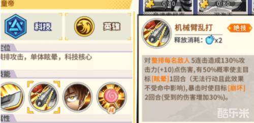 晕眩流这一块的角色的话在游戏中还是没有灼烧,崩坏这些角色那么多,再一个其晕眩的话也并非像另外几个种类那样百分之一百的晕眩,而是只有百分之五十的晕眩。像下面这个图,游戏中最难获得的角色之一 童帝就是,绝技是晕眩对方的,暴击的时候还附带崩坏的一个效果,当然童帝也不是靠这个吃饭的,而主要在于他的被动效果,每次行动后,给己方同排队友增加1个回合的暴走状态(也就是造成的伤害增加百分之30)