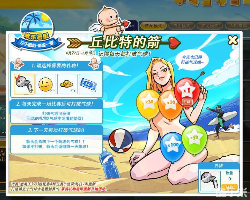 6月27日服务器维护后至7月10日服务器维护前,玩家每日通过完成比赛就可以打破气球,打破气球后可以获得已选的礼物*气球中写的倍数。