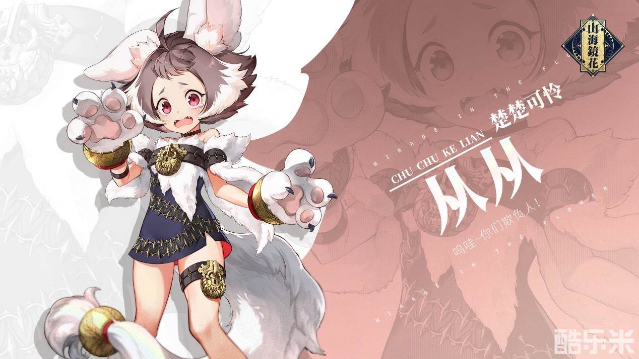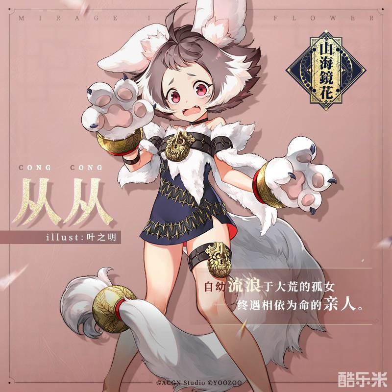 《山海镜花》中的从从身形玲珑小巧,仅仅穿着深蓝色单薄布袍,胸口与腿部皆有金色锁形装饰,行动敏捷的她哪怕居无定所也能及时逃避危险。作为游荡山间的妖兽,从从的人形外表下保留了诸多兽的特征,纯白似雪的绒毛遍及全身,伸展至脚部的兽尾尤为灵活。纯白透粉的兽耳竖高高竖起,中间一撮呆毛突显天然气质。从从的双手同样保留了兽爪的外形,软乎乎的粉色肉垫总是让人想要捏上一捏。