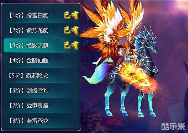 独角龙马是带有翅膀的,在此次不删测改为绝影天骐,两者颇为相似,后者的翅膀变小了。小编想想其中原因,职业角色背上一对翅膀,龙马一对翅膀,这是谁带着谁飞翔呢?嘻嘻!小编纯粹瞎扯淡哈。