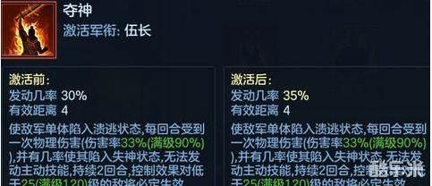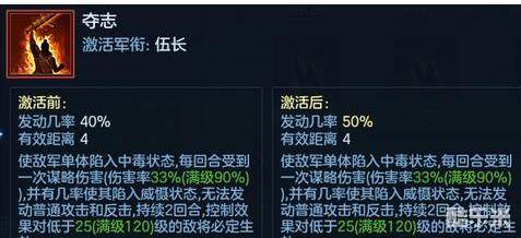 答:这就要涉及到武器铭文强化问题了。一个武将只能佩戴一个武器,也就是只能强化一个技能,把【夺志】和【夺神】分别分配在两个将身上就是为了强化这两个技能,提高他们的发动几率,打出更好的控制效果,不过如果是董白的组合,那么完全可以把【夺志】和【夺神】佩戴在董白身上。(技能强化效果如下图)