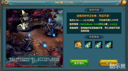 【神魔之战】副本需要2-4人组队进入。每天有2次进入的机会。“女神雕像”位于【神魔之战】副本地图中心,一大波一大波小怪会从地图四个方向攻击“炮塔”和“女神雕像”,进入【神魔之战】的玩家分别要从4个方向截击小怪。当“女神雕像”被小怪击碎,则意味着该副本完结。