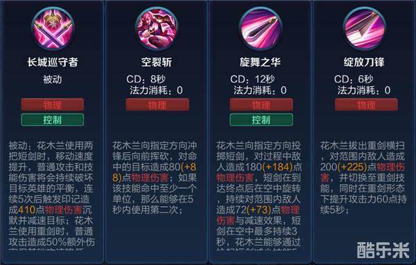 解析:二技能可以说是花木兰的核心技能。这个版本中花木兰的一技能削弱后,二技能就成为了主点技能。在前期时,花木兰能利用二技能的持续性范围伤害,搭配一技能快速地清野。如果是在反野蹲敌人,可以预先释放二技能减速敌人,然后再用一技能突进敌人打出被动效果。打完双剑形态的一套伤害后,马上就使用大招切换重剑形态的二技能,将敌人击退至逃跑路线的反方向。在gank敌人时,花木兰需要判断敌人是否拥有位移技能。如果面对是马可波罗这类的射手,可以先将二技能丢到马可波罗的逃跑路线上。当马可波罗使用二技能向后撤退时就会被减速,这时就快速释放一技能上去打出被动效果,然后切换重剑二技能将其击退,配合队友将其击杀。团战时,二技能也可以作为消耗技能,用来压制敌人血量或者打散敌人的阵型。待敌人交完控制技能后,花木兰可再扔出一个二技能减速敌人,然后衔接一技能位移上去,切换重剑秒掉脆皮。团战中重剑形态下的二技能,可以发挥出很大的作用,能将残血的敌人往队友方向击退。使用得当的话,还可以利用霸体效果破除一些英雄的硬控,例如墨子和王昭君的大招。