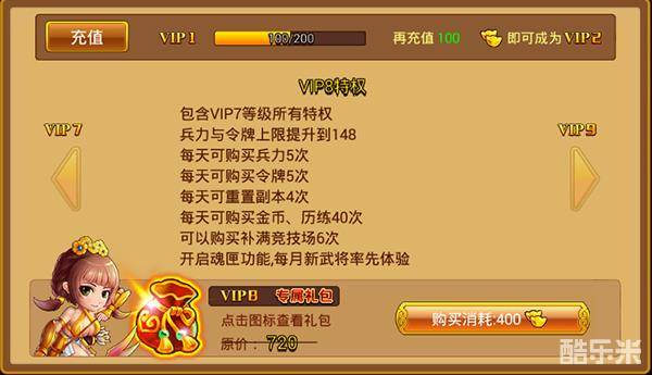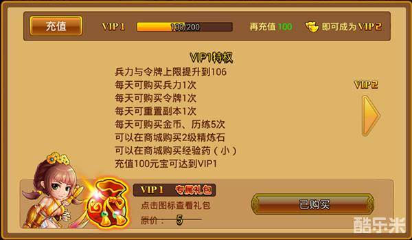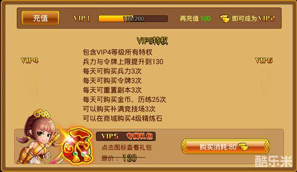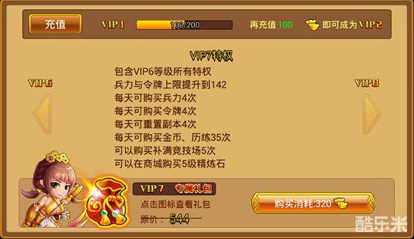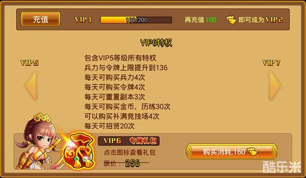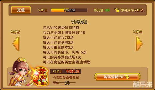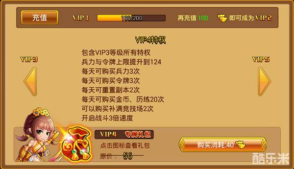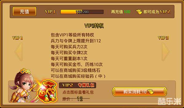 根据玩家的充值额度的不同,玩家获得的VIP等级也不同,不同VIP获得的特权也不相同。VIP具体特权如下方所示,以此类推,充值VIP能使游戏过程更加轻松。