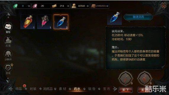打开背包,背包下面有一栏分类,这里有精品、时装、消耗品、药水、装备、宝石等等,玩家找到药水栏,直接点击进去就可以了。