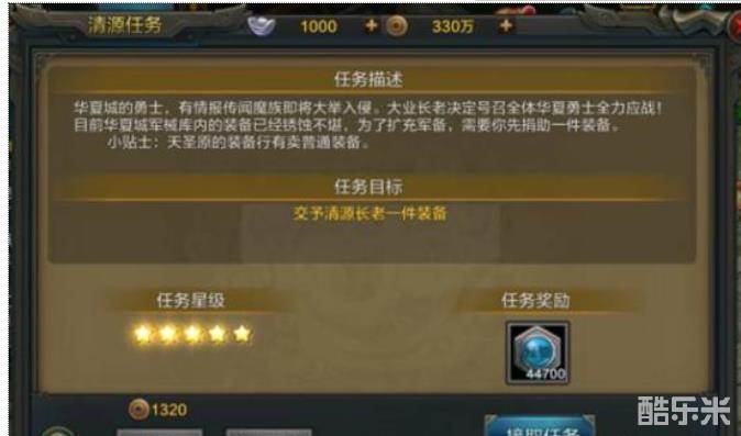 清源任务可从清源长老处接取,共分为五环。每环可获得的经验会依次提高,而每一环又有五个星级,五星才是最高经验的任务。想当年为了一个五星任务,刷破产的英雄也不在少数……