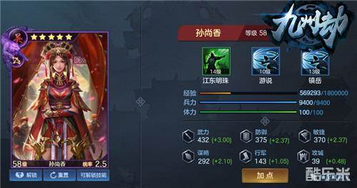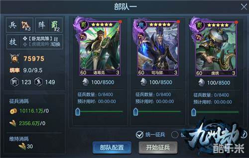 《九州劫》部队可配置大营、中军和前锋,拥有成熟的骑兵、枪兵、弓兵3大兵种克制体系,包含85种名将组合技的设定,大大增加了配将的策略深度。例如:“卧龙”诸葛亮和“凤雏”庞统在同一支部队,可激活武将组合【卧龙凤雏】;同时游戏的装备玩法也十分独特,每件武器有3个天赋铭文,所有武将均可以搭配不同的技能天赋,游戏的策略性大幅度提高。