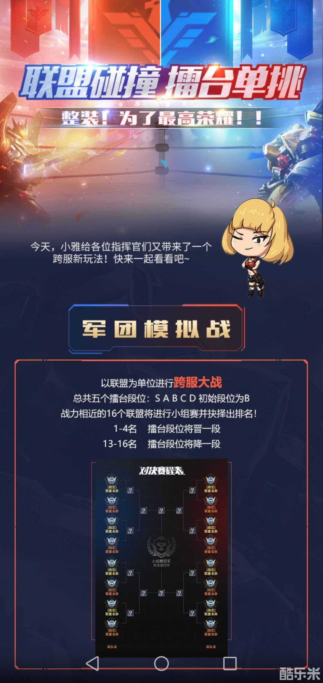 武器军备升级后,《红警OL》跨服新玩法---军团模拟战即将闪亮登场。这是以联盟为单位进行的跨服大战。总共有5个擂台段位,由战力相近的16个联盟将进行小组赛并进行排名。
