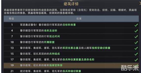 鸦巢塔的作用就是随着等级提高为领主提供更为详细敌军情报,方便领主做出决断。