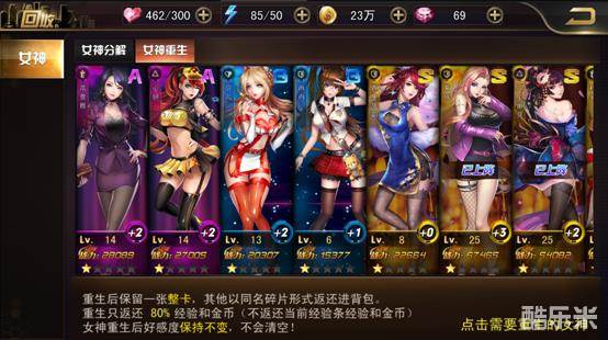 点击回收后能够看到自己培养过的所有女神,可以通过回收让高级的女神等级重生变回1级,并且返还80%的经验和金币,而且女神重生后是好感度是不会变的。