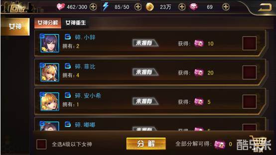 或者可以把女神多余的碎片分解,获得一定的女神兑换券,去女神商城购买自己想要的女神碎片。