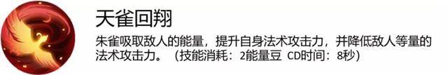 朱雀死亡后可满血复活1次,在复活之后全程提升20%(满级30%)法术攻击力。通俗地说,朱雀有两条命,并且在第二条命期间,自身攻击力提升,是不是听上去就很赞。