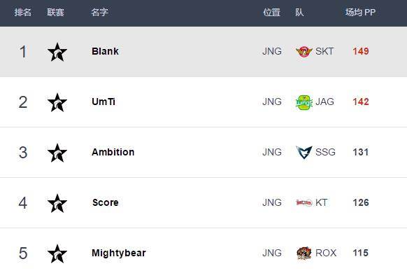 Best.GG最近更新了LCK第二周结束后的选手PP值榜单,本周发挥出色的SKT打野选手Blank登顶打野位排行榜,积分榜排名第二的Jin Air两名上单选手均进入前五,中单位则由Longzhu中单Bdd占据榜首,AD及辅助位的第一名则分别由Jin Air AD选手Teddy和三星辅助CoreJJ获得。