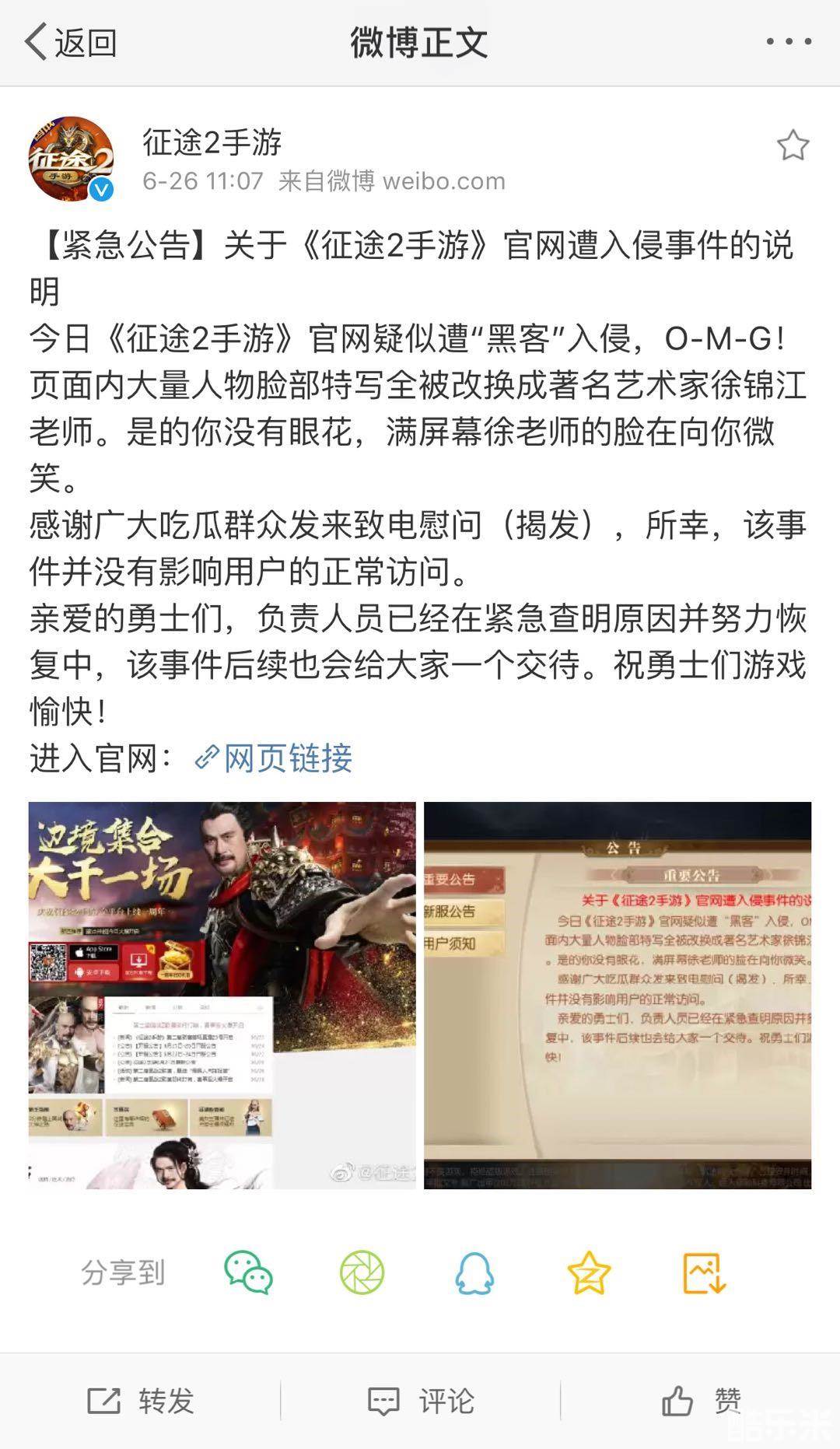今日,《征途2手游》官方网站遭到不明身份黑客攻击,该官网页面上所有人物形象的面部,均被换成著名表演艺术家徐锦江先生的面部特写。