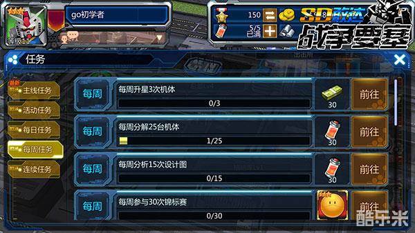 【每周任务】玩家可以通过机体升星、分解机体、分析设计图和机体强化、合成等的任务来积累经验,获取奖励,丰富自己的宝库。同时建议游戏时间有限的玩家来说,要想在有限的游戏时间内获取更为丰厚的经验奖励,那么可以考虑先完成每周任务了,此时不玩,更待何时!