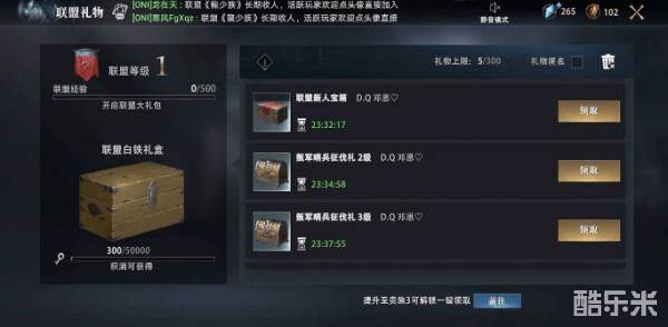 3、联盟等级经验可由领取联盟大礼物获得,累积经验值可提升联盟等级;