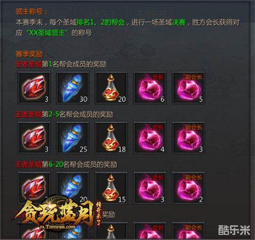 本赛季末,每个圣域排名1、2的帮会,进行一场圣域决赛,胜方会长获得对应“XX圣域领主”的称号。部分赛季奖励如下图所示: