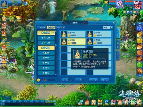 然而还有更加方便快捷的方法,如果你害怕吃人参不靠谱,或者不想等待煎熬的三天时间,只想尽快抱上娃,那就使用道具“送子观音”来直接获得一个子女,省去了生育的过程。上面说的三种道具全部可以在寄售商城用金币买到哟~