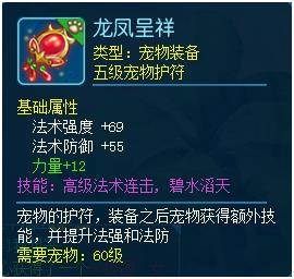 五级护符,可以说是很高大上了,带高级法术连击加群法碧水滔天,可以说是能让一只法宠脱胎换骨的护符,唯一美中不足的是附带了12点力量,问题不大。