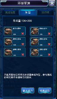 环球军演可以通过和玩家战斗来获取排名,更高的排名获取更高的奖励。这是PvP的战场,玩家间最直接的对话,也是检验自己部队实力的地方。竞技部分是游戏中最为激烈的环节,每个玩家都渴望展现实力称霸排行榜,调动你的部队在战场上大杀四方吧!