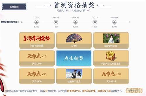 7月8日-7月12日,每日12:00可在官网天命站进行资格抽取,共放出2500名测试资格!拥有“下测幸运符”的少侠,别忘了在背包点击使用后再抽奖哦。除了抽奖奖励,刀妹还在天命站准备了超多福利回馈各位抽不到码的少侠!再次感谢每一位小可爱的包容。