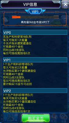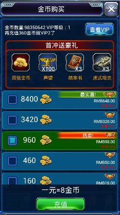 玩家可以在这里使用RMB购买游戏中很重要的金币,并获得一定的优惠!玩家充值到一定数额可以获得相对应的VIP特权,让你在游戏中快人一步!可以说充值功能的爆发性很强,可以让你一下子从屌丝变成高富帅。但充值又不是盲目的,充的多是会很爽,但是体验游戏真正的乐趣更为关键!