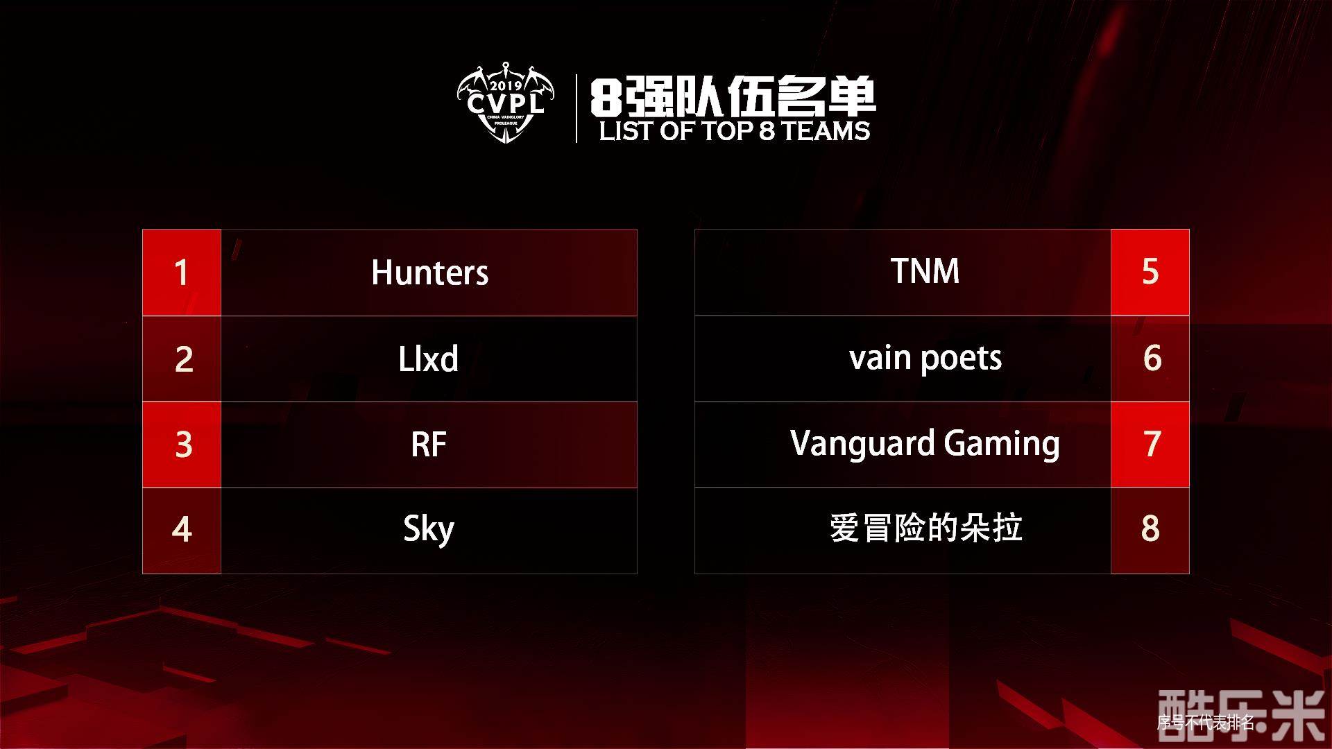 经过两周的激烈绝杀后,上周末(6月22日、6月23日)CVPL预选赛的C、D小组也完成了最后的争夺战。目前,八强战队已成功集结,他们分别是: