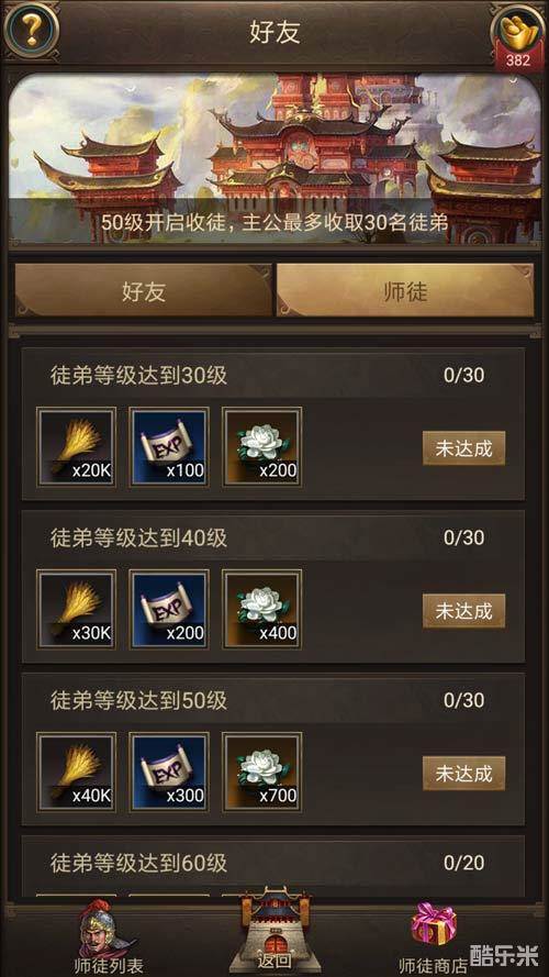 当主公等级达到50级后,便可在《正统三国》好友系统师徒板块中进行收徒,最多可收取30名徒弟,当徒弟达到指定等级,便可领取相应奖励,如主公经验、友谊积分、洗髓丹、良将令、神将令等。而如若主公等级未达50级,则可选择50级以上的同国主公进行拜师,拜师成功后即可获得新手礼包,并且好比忠臣不事二主,主公也只可拜一位主公为师。