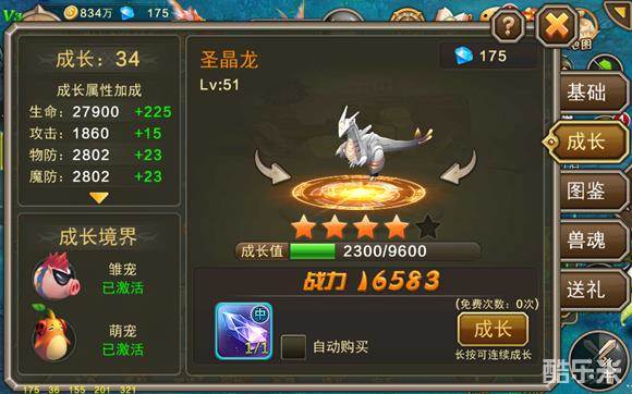 宠物前期只会开放属性、成长和图鉴三个标签,属性是查看玩家宠物信息的地方,如属性、经验和激活的技能等;成长标签内可以使用成长水晶提升宠物的成长等级,激活成长境界从而获得属性加成;图鉴标签内玩家可以通过搜集到的宠物魂片激活新的宠物形象或者对旧的宠物进行升阶,提高宠物的战斗力并且激活宠物技能。成长水晶可以通过商场购买,所以有条件的玩家能一口气把宠物成长培养到很高的等级,而宠物图鉴除了圣晶龙只能通过淘宝获得,白、绿、蓝三种品质的宠物魂片可以通过宠物副本获得,紫色的宠物魂片可以通过幻兽群岛玩法获得。后续还会开放兽魂和宠物送礼系统,因为开放等级较后,作为新手攻略这里就暂不介绍了。