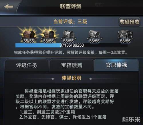 有些主公会想,等级提升得快和提升得慢,对一周内领取的礼包会不会有影响?其实是没有影响的。就算联盟的评级处于低阶段,主公充值或购买礼包均会增加所有阶段可领取礼包的数量,联盟只要提升到对应阶段就能解锁宝箱并领取。所以主公们不用急于短时间内提升联盟评级,只要一周内提升到第六阶段即可。同时,官职人员可以根据上周的联盟评级,每天额外获得宝箱奖励,联盟内的官员应更努力提升联盟评级,为自己和联盟的伙伴们谋取更多福利!