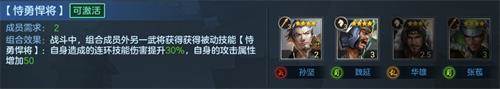 ★★★ 【持勇悍将】〈孙坚 张苞 华雄 魏延〉 组合技(被动):另一武将连环伤害+30%,攻击属性+50 点评:早期稳定菜刀输出,一般配个易得的光秀、文丑+魏延就可以打打,缺点是强度低四星通病,后面就不再赘述了。魏延+光秀还可组反骨也是早期过渡组合。