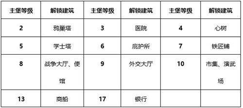 主堡是游戏里的核心建筑,25级满级。它是领地的中心、领主的住所,是一切建造和行军的基础,只有主堡达到一定等级,其它建筑才有更高的等级上限。游戏内的心树、学术塔、铁匠铺等重要建筑更是必须主堡提升至一定等级才能解锁。具体解锁情况如下:
