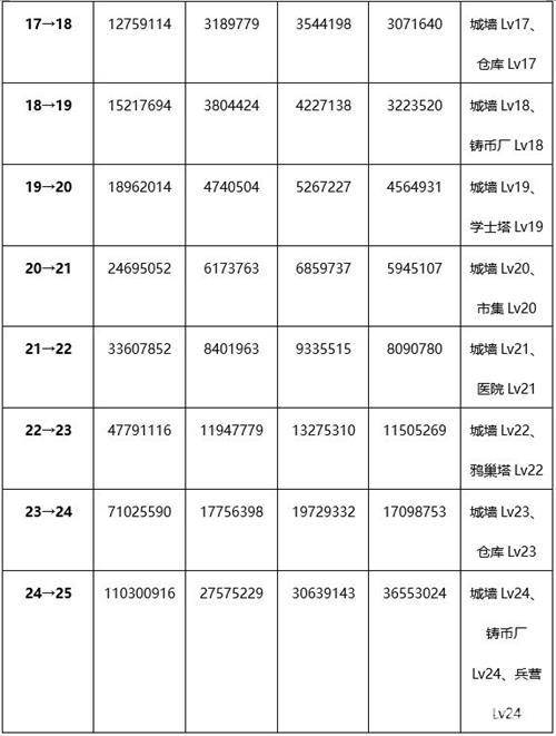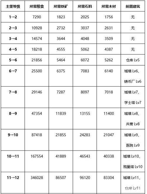 主堡每升一级都需要消耗一定的粮食、铁矿、石料与木材等资源,其提升至5级以上后,都还需一些前置建筑达到一定的等级主堡才可继续升级。且主堡所升等级越高,需要消耗的资源越多。