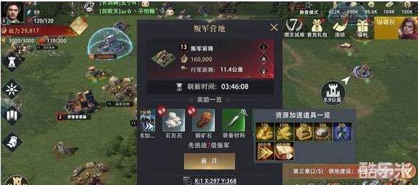 若对手是叛军营地/资源点,领主可在右侧看到行军时间、战斗预判、实力对比、资源储量、预计采集量、采集消耗时间等相关信息。一些数据会根据出征兵力进行即时变化,便于各位领主直观的了解出征效果。