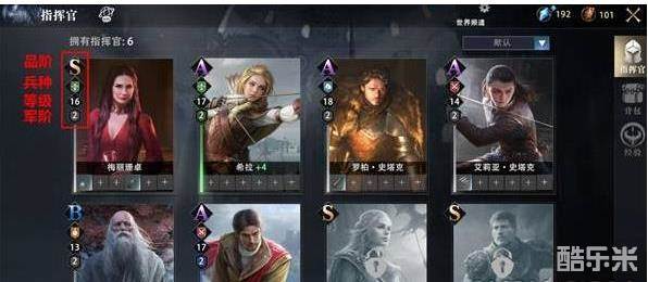 根据属性不同,指挥官有三种分类方式。其一是根据兵种,艾莉亚·史塔克是步兵指挥官,梅丽珊卓是弓兵指挥官。其他指挥官,也分别有对应的兵种。作战时,指挥官可以拥有所属兵种的亲卫方阵,并为所属兵种提供BUFF加成。