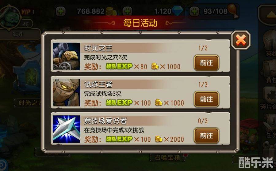 15-20级:每日活动增加了很多,点金手、时光之穴等,先把每日活动做完,然后后一直打普通本,打到普通本卡关的时候就去打精英本。精英本也卡关的话,就返回前面的副本刷装备,把所有现阶段能获得的需要装备在英雄身上的装备都打好,再合理利用技能打断,之前挑战失败的关卡一般都能过。