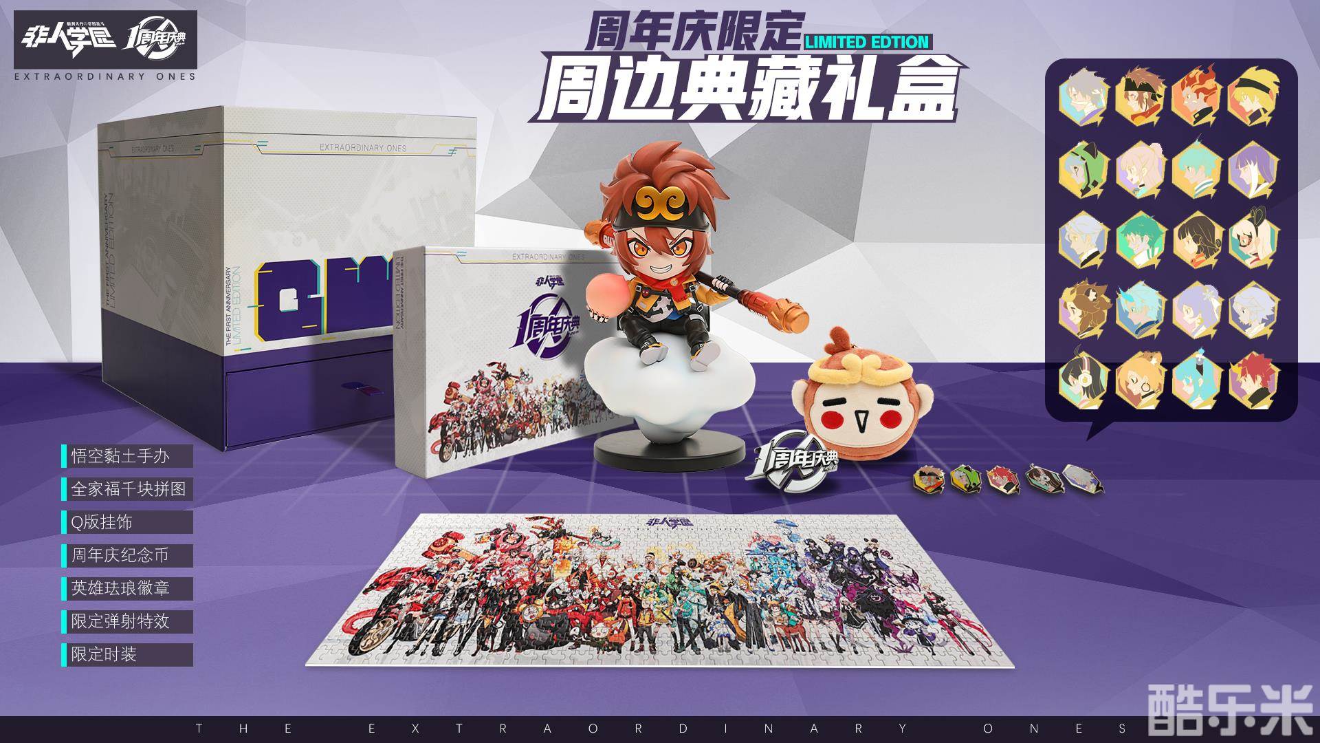 作为《非人学园》一周岁生日的重磅献礼,周年庆限定周边典藏礼盒包含了超丰富内容。最抢眼的内容,当然是可爱与实力兼备的二头身悟空黏土手办。全家福拼图(750pcs),也让人很想收藏,一块块地拼出学园脑洞大开的明星们的大合照,想必成就感满满。Q版悟空挂饰,无忧无虑的笑容让人看着心情都美好起来。英雄珐琅徽章,有悟空、红孩儿、大鹏、钟馗、白灵、精卫等等各种款式,你最喜欢谁的呢?限定弹射特效与限定时装,则能让你成为学园战场上最闪耀的明星。最后还有周年庆纪念币,更是大家与学园走过最初这一年的最好纪念!