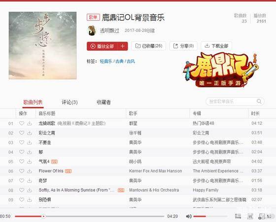 在《鹿鼎记OL》端游中,不同场景的音乐或繁华、或幽静、或宏伟、或别致,很多玩家都曾驻足于某些场景不愿离开,就因为被这场景中的音乐打动。甚至到了八年后的今天,游戏的bgm依然是不少玩家生活的背景音乐。