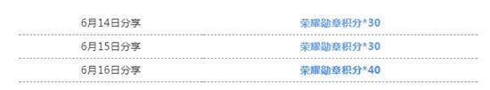 荣耀勋章积分还有二重惊喜!6月14日-6月16日期间,在游戏内-活动中心每日分享活动共可领取荣耀勋章积分*100。