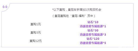 6月14日-8月18日期间,参与限时开启的钻石赛车工坊即有机会获得永久A车迅捷流星。参与打造用的橙光能源可以通过在商城购买橙光能源宝箱获取,售价30钻/个。